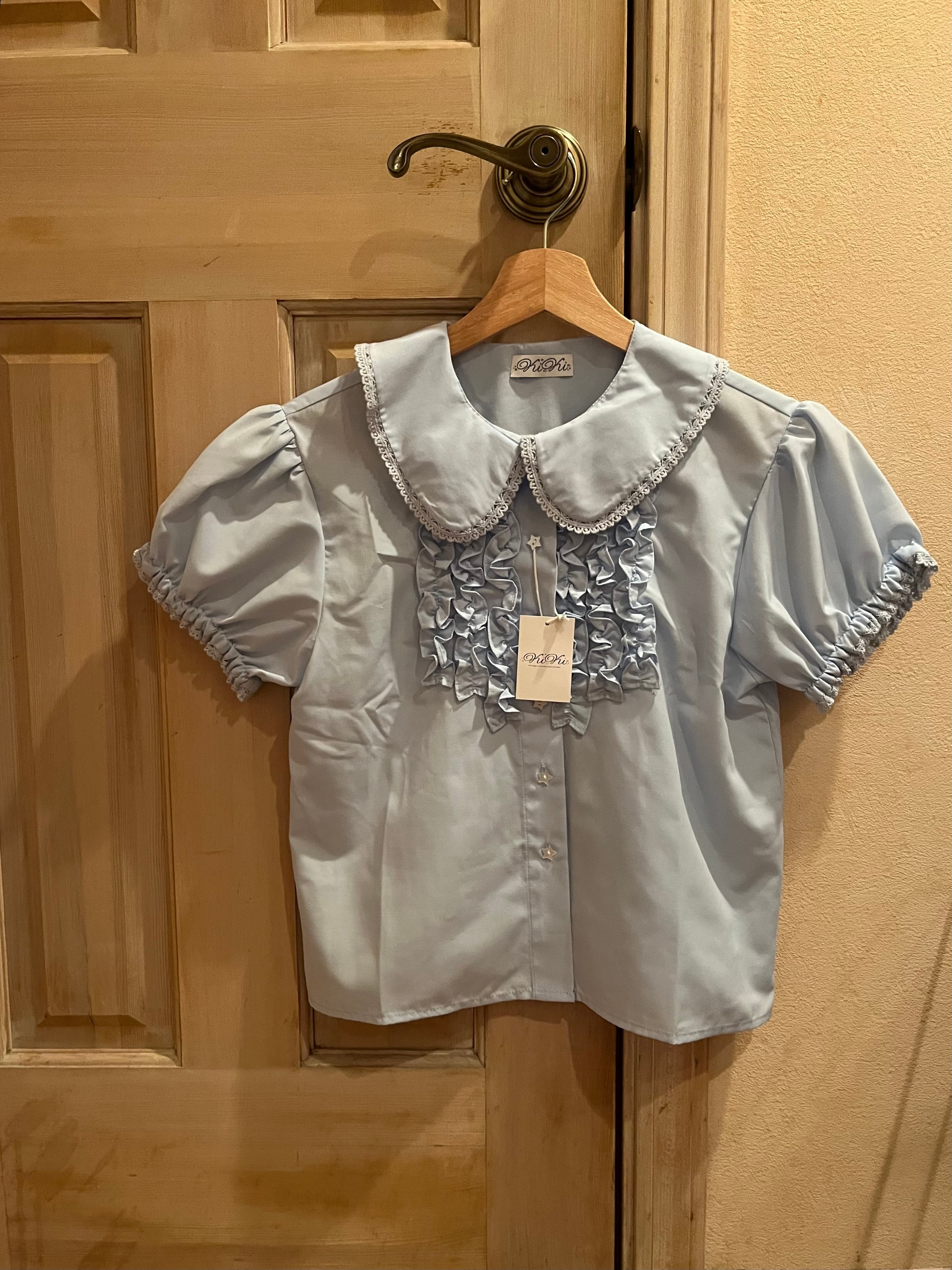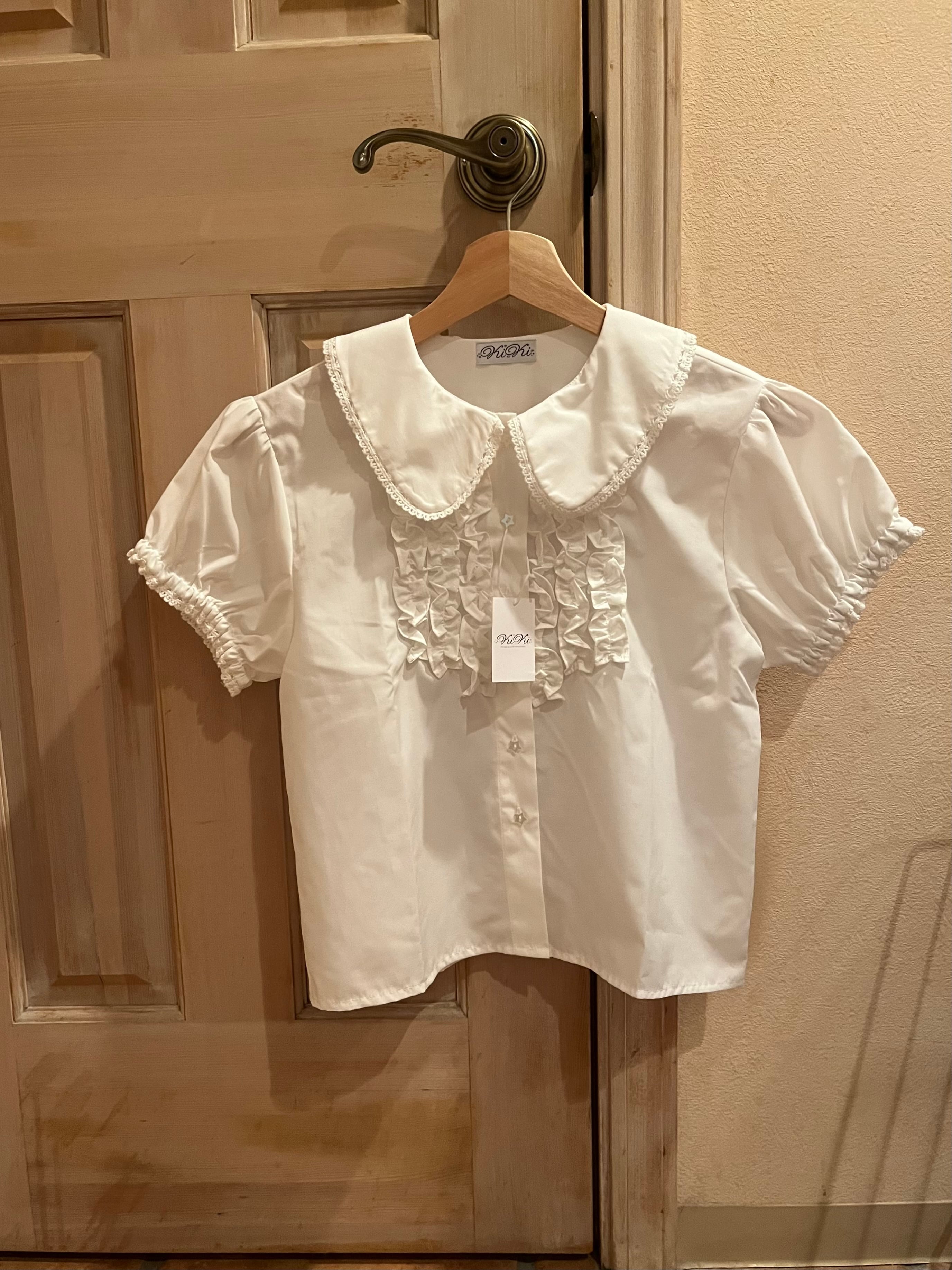 フロントにたっぷりのフリルが存在感を放ち、星型ボタンのさりげないきらめきと、袖口・襟に施された繊細なレースが細部まで可愛さを演出。