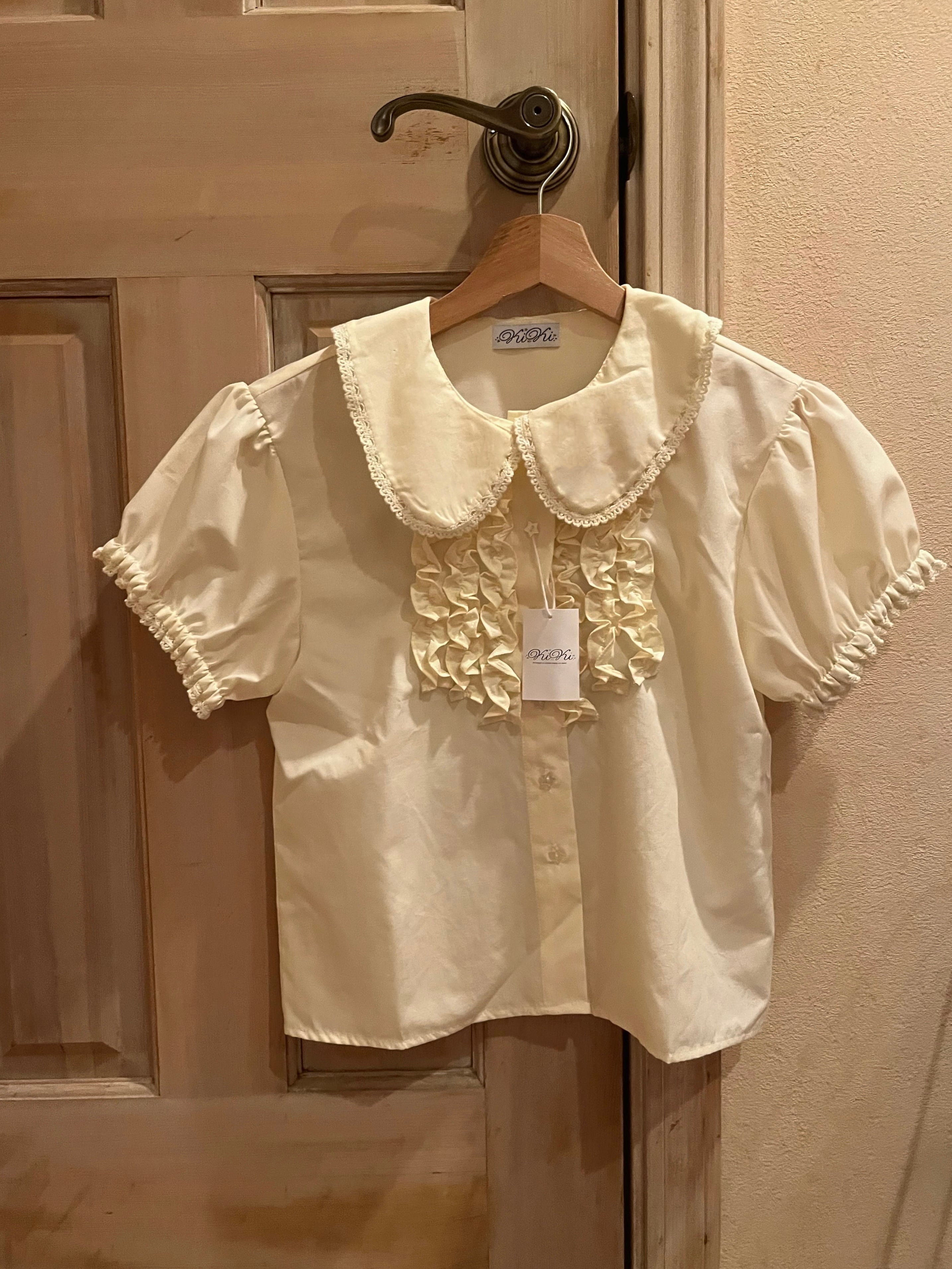 丸襟とパフスリーブが愛らしい印象を与える、とびきりガーリーなブラウス。